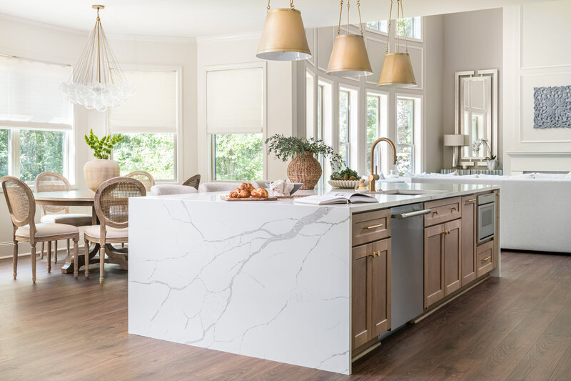 Modern Elegance captures the perfect balance between timeless sophistication and contemporary comfort. This open-concept kitchen and living area showcases a fresh, airy aesthetic defined by crisp white cabinetry, warm brass accents, and rich natural textures. The expansive quartz waterfall island serves as both a stunning focal point and a functional gathering space, complemented by soft upholstered barstools and a sleek brushed brass faucet. Overhead, statement pendant lights cast a gentle glow, enhancing the room’s inviting atmosphere. The kitchen’s clean lines are elevated by a bold matte range hood and stainless-steel appliances that introduce a touch of modern contrast. Flowing seamlessly into the living room, the space features a cozy fireplace framed by neutral artwork and balanced with plush seating. The design blends warmth, sophistication, and everyday usability—an effortlessly stylish retreat that feels both luxurious and livable.